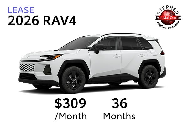 Qualified lessees can lease a new 2026 RAV4 4WD 5Dr. Wagon LE Hybrid CVT Model 4435 for $309 per month for 36 months with $3,999 Due At Signing. Based on 10,000 miles/yr. Security Deposit waived. Lease excludes tax, title, license, registration fees, acquisition fee of $750, and dealer options and charges. Price excludes tax, title, registration and negotiable $998 dealer conveyance fee. Offer ends 03/31/2026